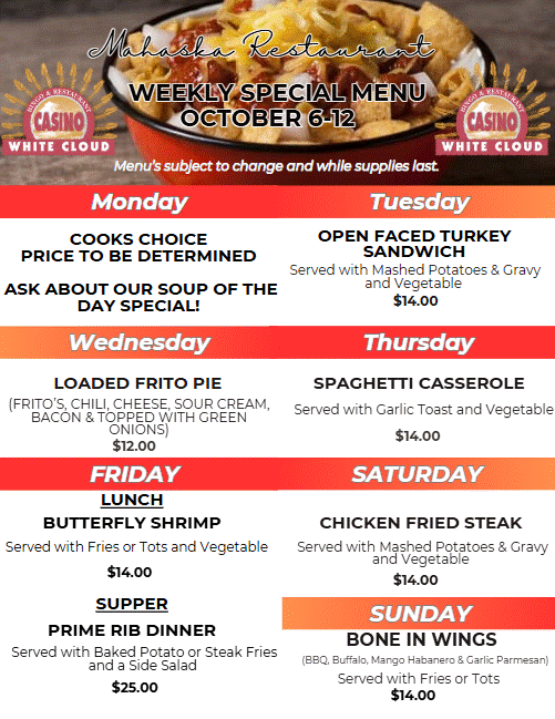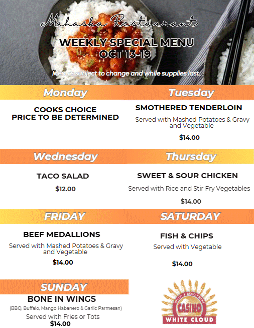 Come in relax and enjoy a meal right here at the Mahaska Restaurant. We offer daily specials and a full menu of your favorite foods!